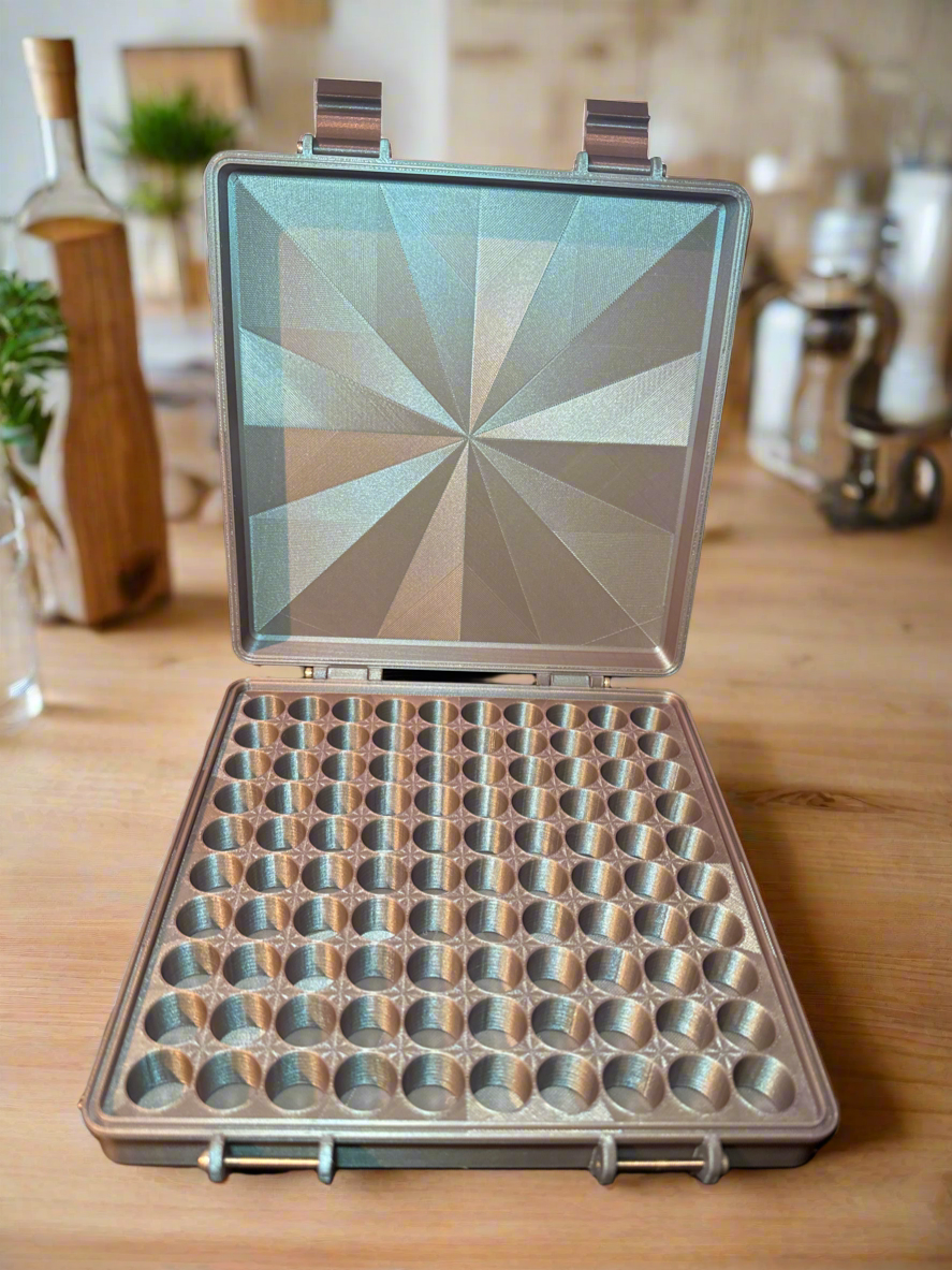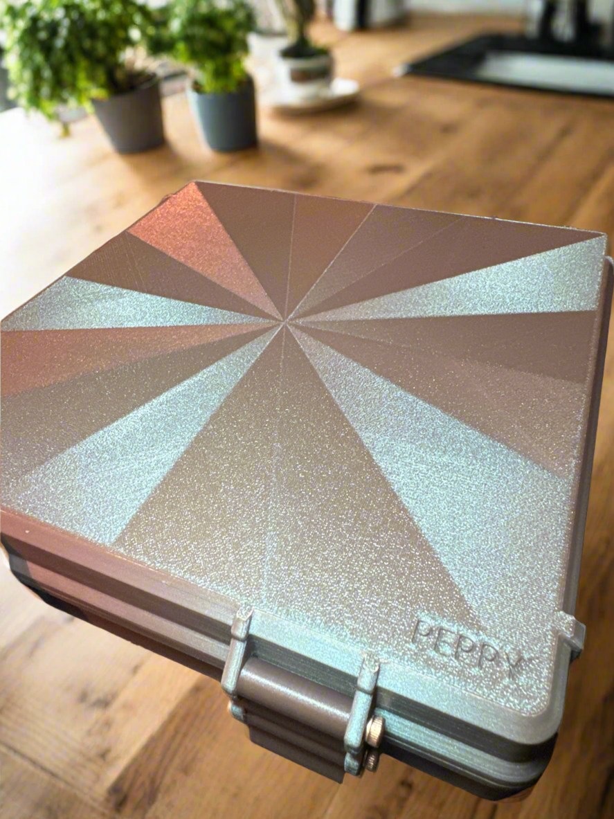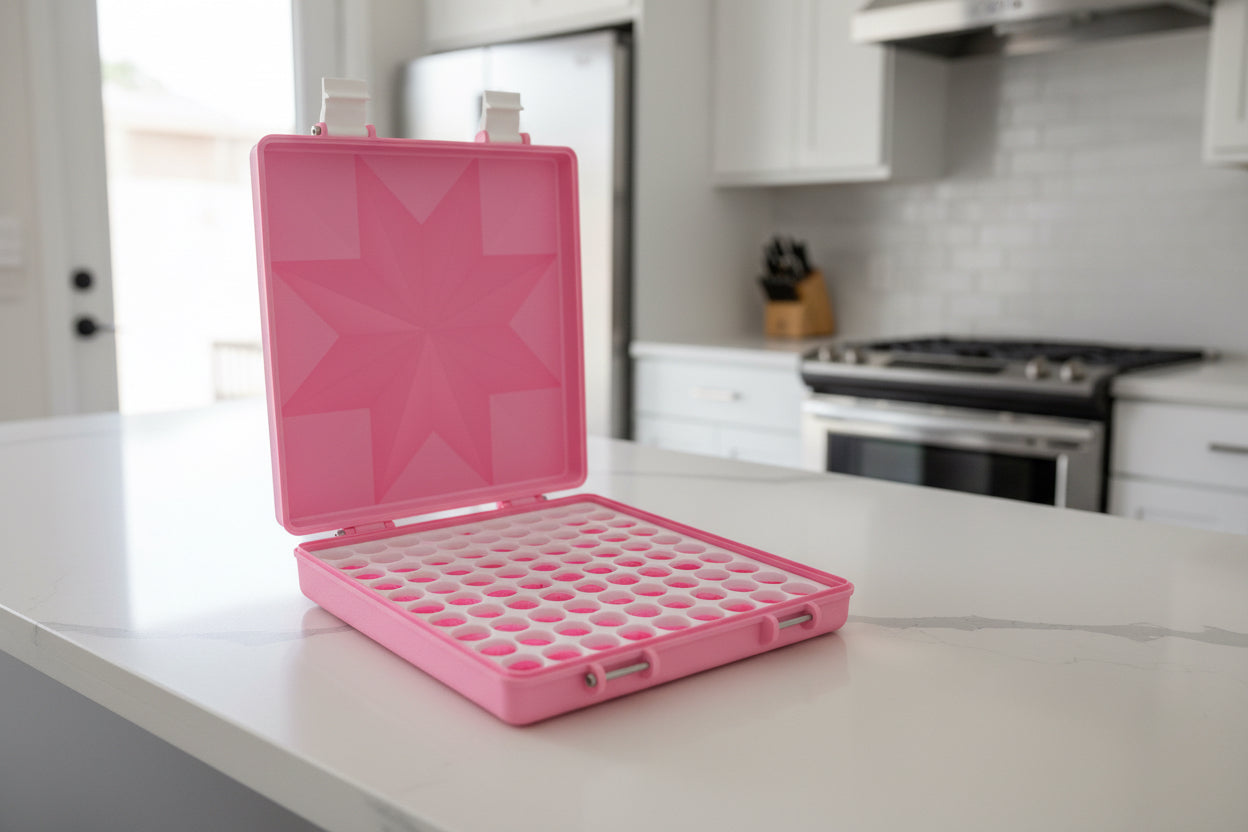 Imagine a sleek, cube-shaped case, perfectly sized at 10x10 units, designed to house 3ml vials. The main body is a clean, pink body with white latches and tray giving it a modern, minimalist look. To keep everything secure, it features crisp white latches that provide a satisfying click when closed. Inside, a neatly organized white tray holds each vial snugly in place, preventing any unwanted movement. It's a compact, efficient, and visually appealing storage solution, tailor-made for peptide vials!