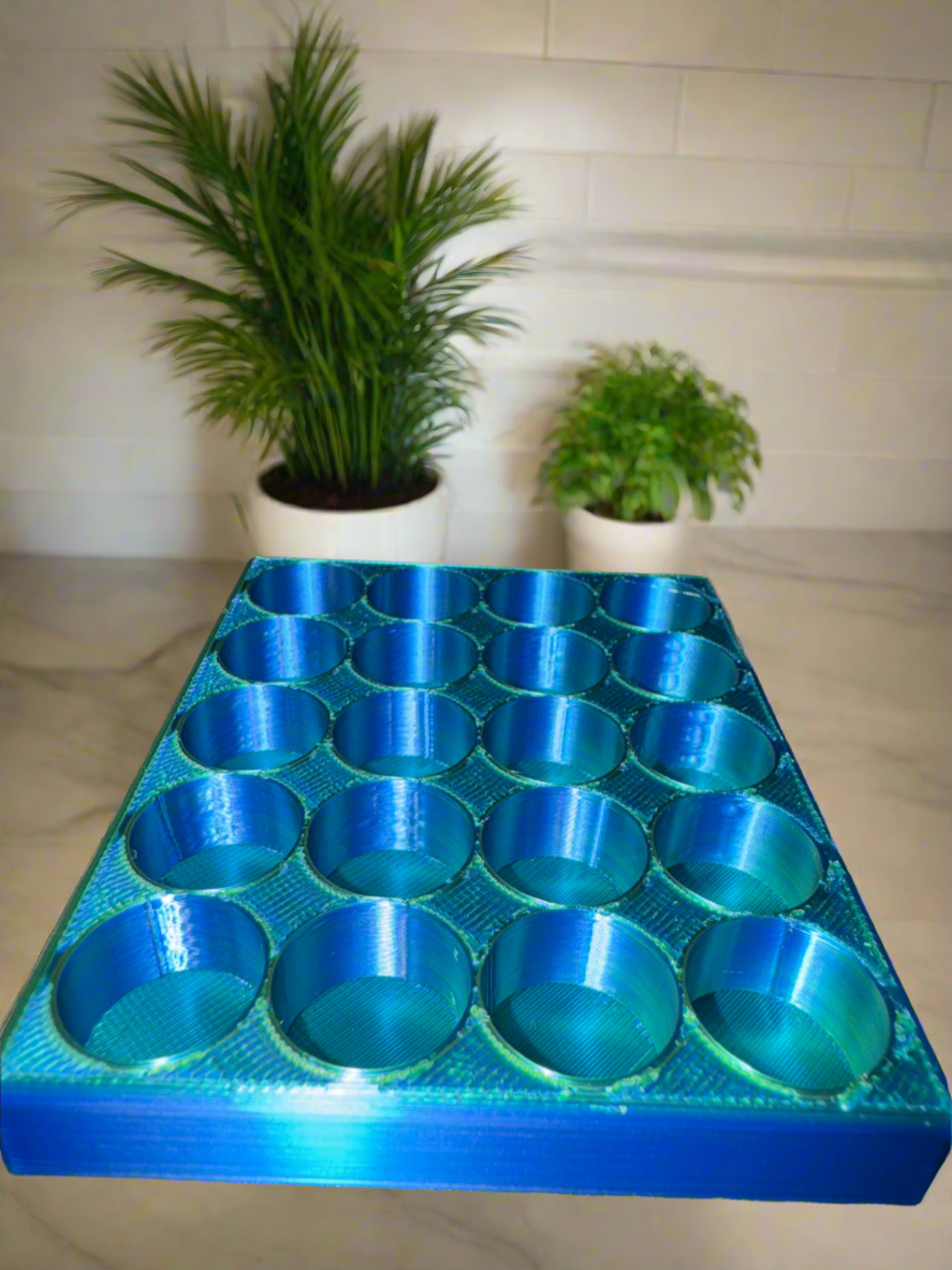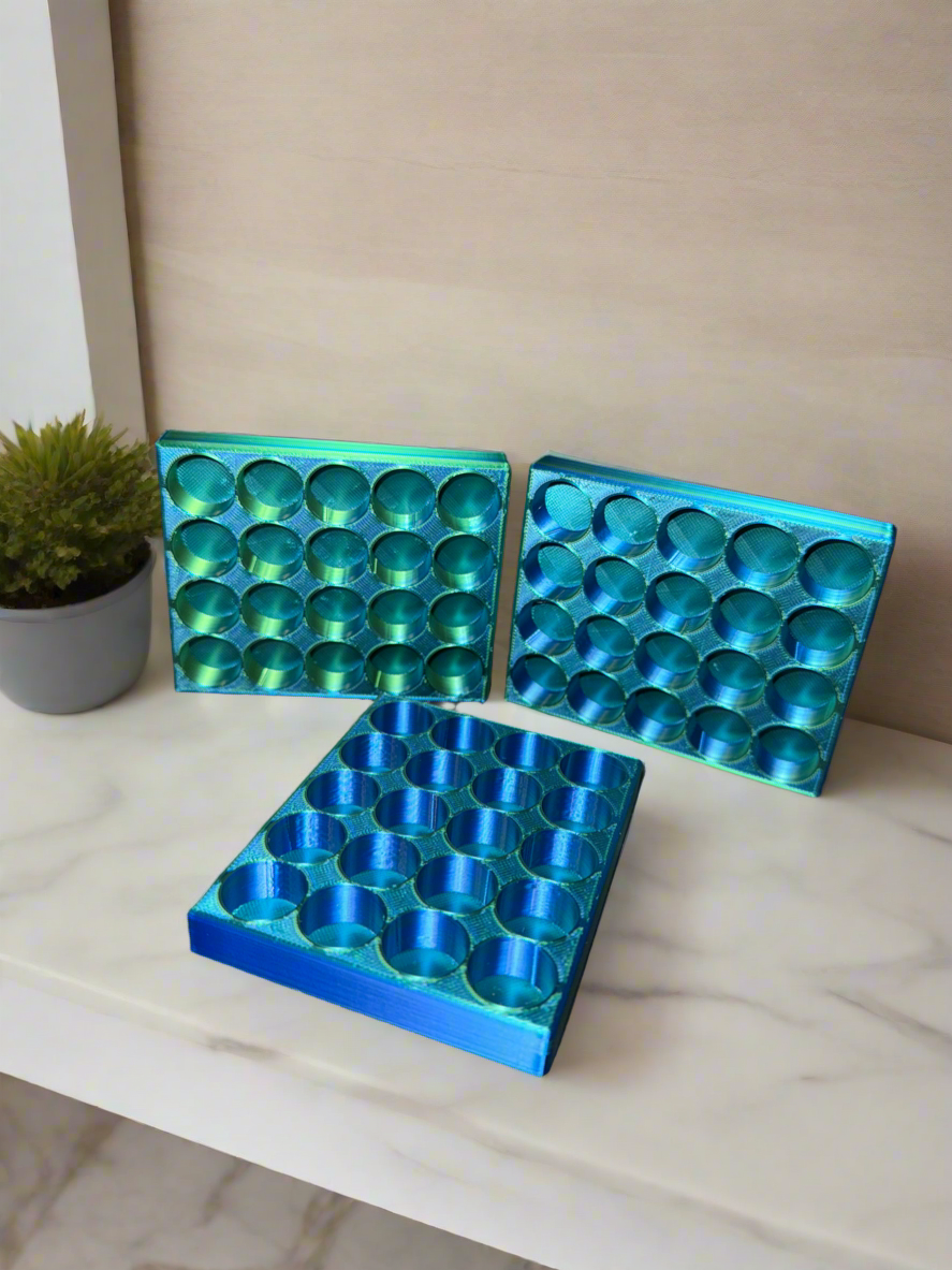 This 3D-printed holder is designed to safely and efficiently store 20 vials (5 rows of 4) of 3ml peptides in a refrigerator. The open design ensures easy access and visibility of the vials. Made from a durable, fridge-safe plastic material, it maintains structural integrity at low temperatures, preventing warping or cracking. The compact 5x4 configuration maximizes space utilization, making it ideal for crowded refrigerators. Each slot securely holds a 3ml vial, preventing accidental spills and keeping the peptides organized. The open top allows for quick identification and retrieval of specific peptides, streamlining laboratory or research workflows.