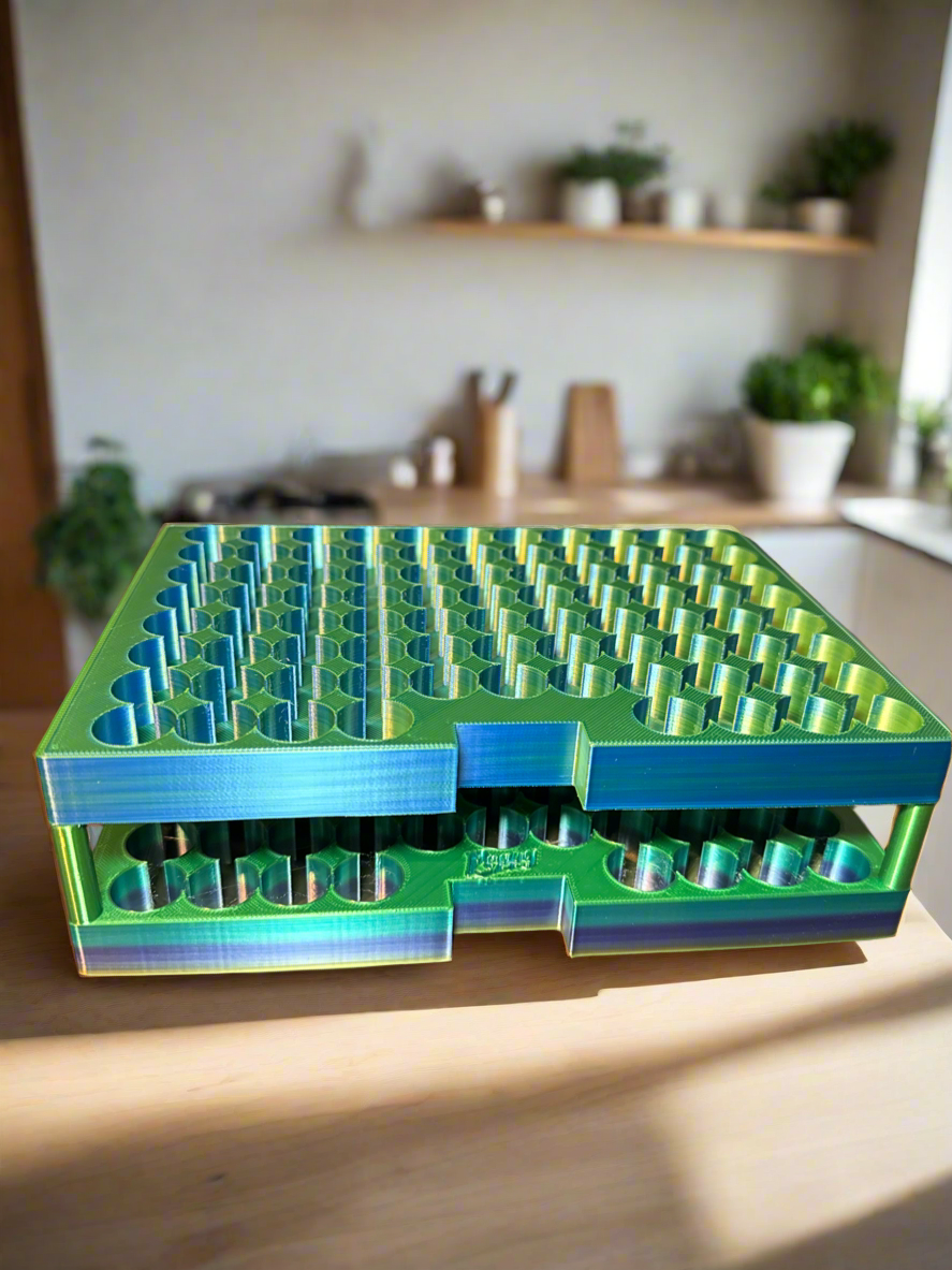 3D printed insert for 170 3ml vials, using a 85 slot top and 85 slot bottom design.