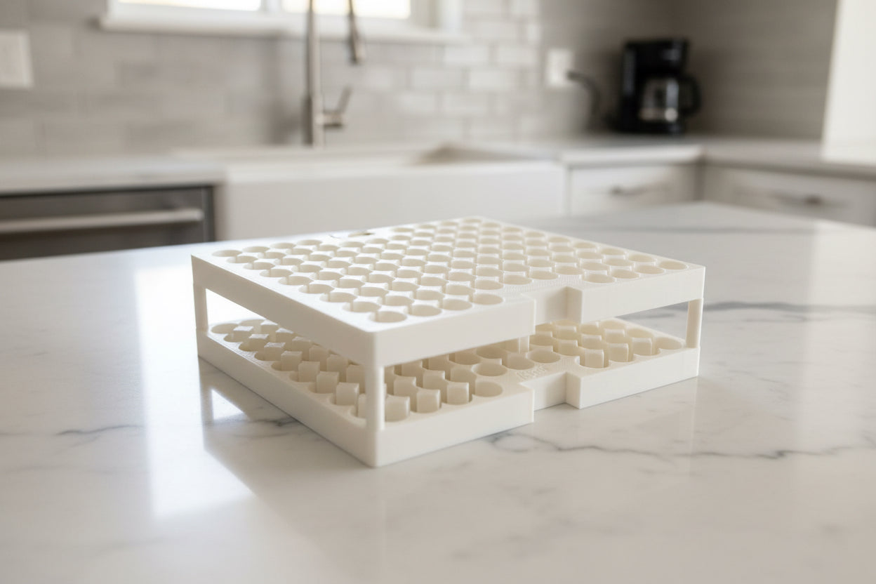 3D printed insert for 170 3ml vials, using a 85 slot top and 85 slot  bottom design.